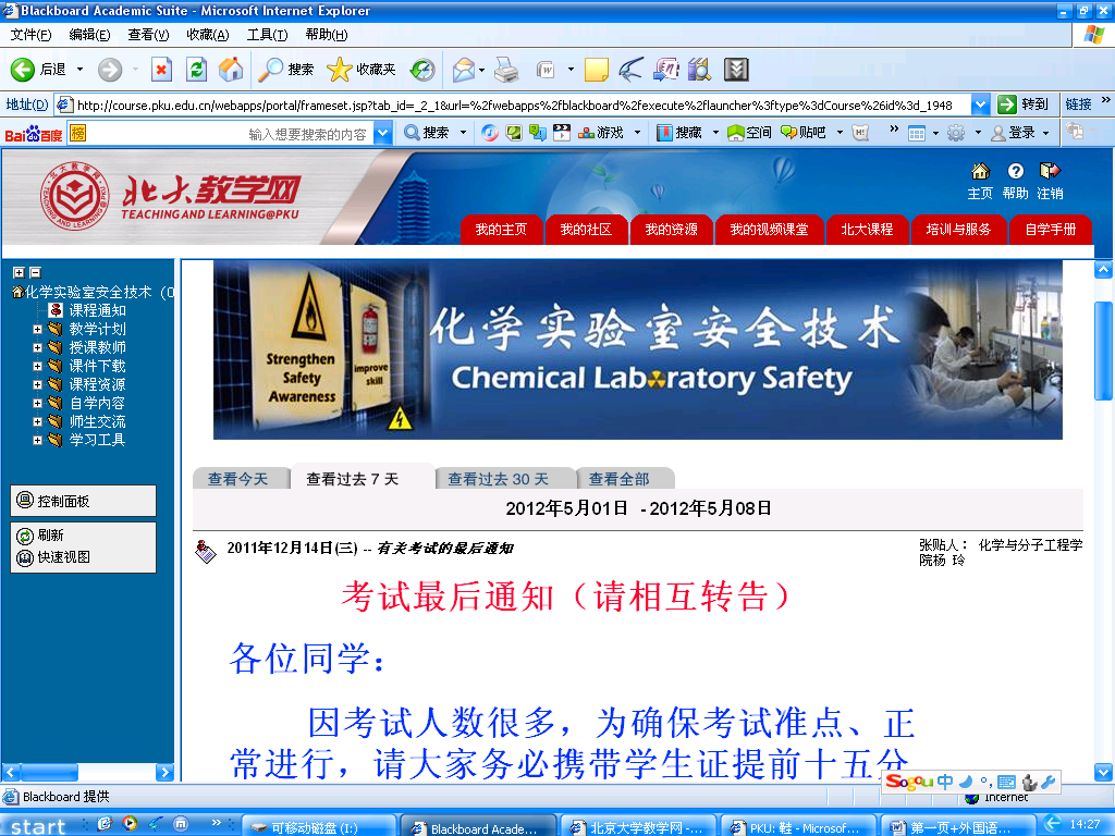 《化学实验室安全技术》课程和《实验室安全技术》(均简称安全课)分别是北京大学化学院本科生和外校考入研究生的必修课。为提高学生学习积极性和实际教学效果,除课堂讲解外,安全课还采用实地参观、演习、专家讲座等教学形式,因而教学场地安排和具体组织形式相对灵活,需要将具体教学安排等重要信息及时通知学生以保证正常教学次序。近年来,除必修本课程的的化学院学生外,还有大量其他院系不同年级和专业的学生自主选修本课程,上课学生人数众多繁杂。如何快捷及时地将具体教学安排等信息通知到每一位学生是近年来课程面临的新问题,而教学网正好为课程提供了信息沟通的公共平台。在教学网上建设安全课后,我将教学安排等通知发布在教学网本课程首页的“课程通知”中,于现代教育技术中心王胜清老师的帮助下在“课程通知”页面顶部制作了醒目的课程横幅,并在编辑“课程通知”时设定合适的通知显示开始和截止时间,这样学生进入教学网课程页面后就能获取最新的教学安排信息;此外,利用“课程通知”中“以电子邮件发送给所有课程用户”的功能,学生可以在自己邮箱收到实时的课程通知。教学网这些基本功能实现了课程信息传达沟通的及时高效,从而保障了教学环节的正常开展。
