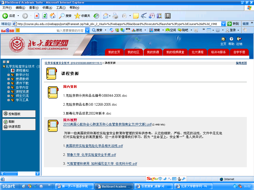 2011年6月,北京大学现代教育技术中心和化学院联合举办的教学新思路化学院专场培训活动正式启动。现代教育技术中心的老师由浅入深地为化院教师举办了数轮“北大教学网”使用培训。通过一系列的培训讨论活动,我对北大教学网有了基本的了解,并惊喜地发现教学网诸多功能非常适合《化学实验室安全技术》课程教学工作,正是我所要寻找的教学助手。2011-2012学年第一学期,我将教学网作为辅助教学工具应用于课程教学中,对混合式教学策略进行了初步尝试,以下是对本课程教学网应用实践的总结和思考。